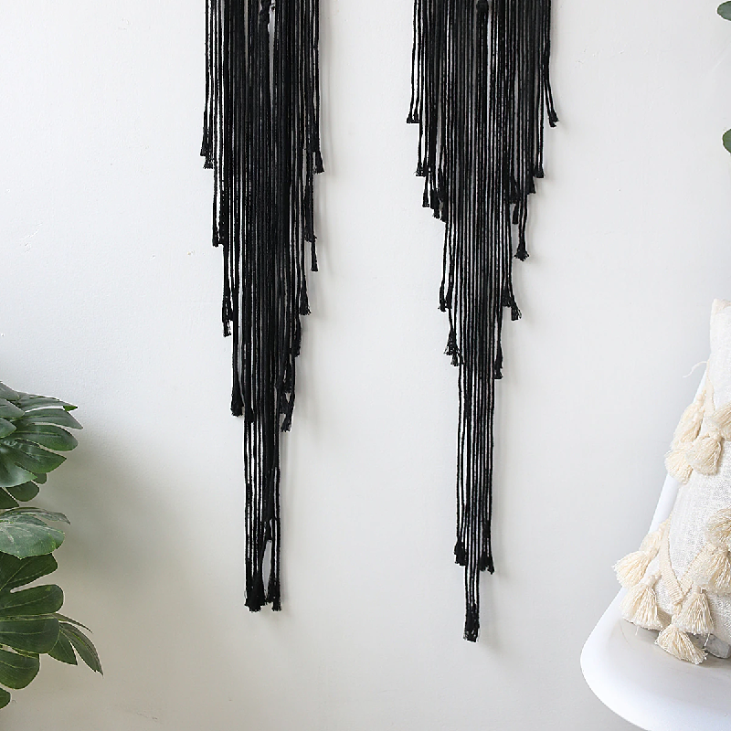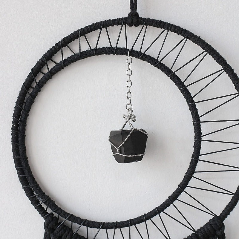 Craquez pour notre réinterprétation minimaliste et moderne de l’attrape rêve en tressage. Avec son tissage noir il tranchera dans votre décoration pour une originalité réelle. Avec son tissage en coton fait à la main et son petit cristal noir décoratif c’est une pièce unique qui n’attend qu’à être accrochée pour embellir votre intérieur.