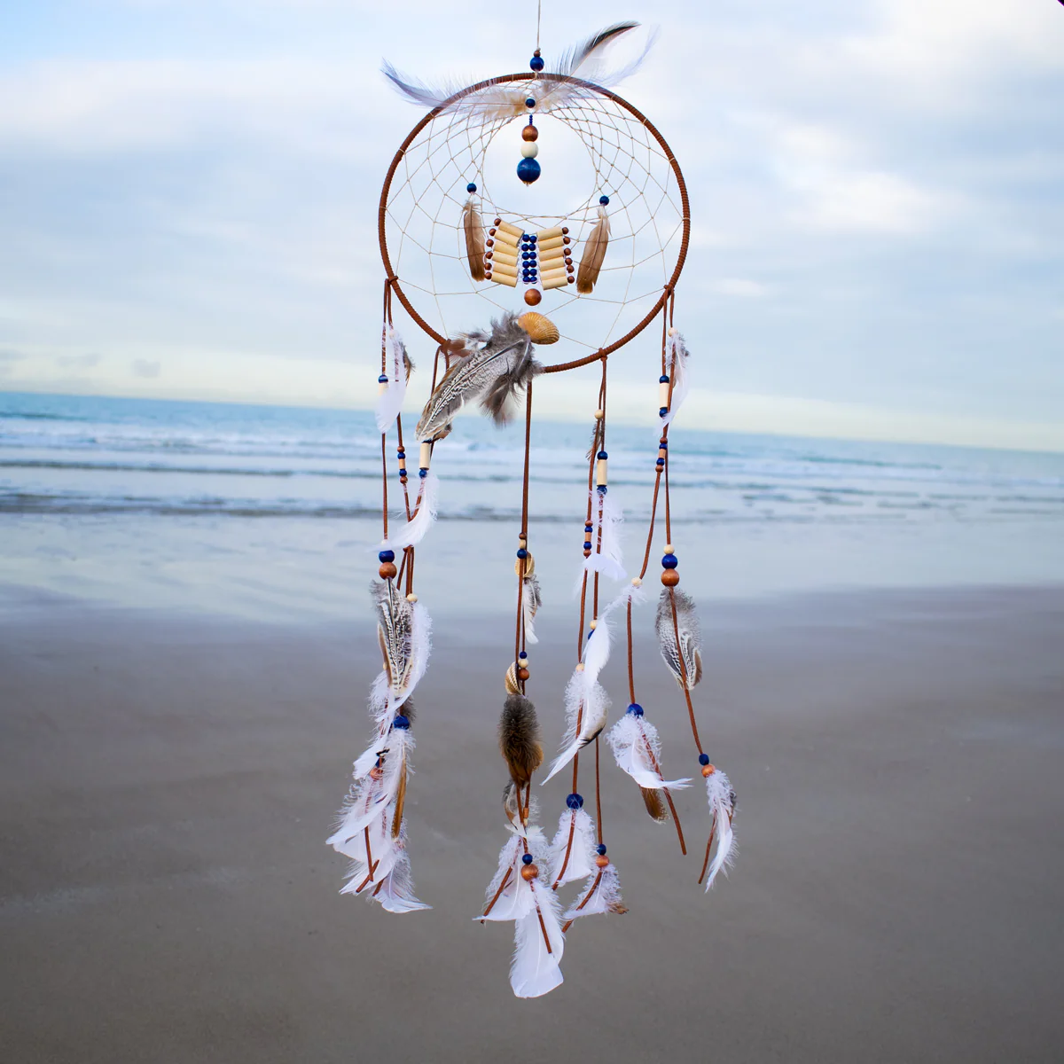 “Enfant de l’eau” est un attrape-rêve marin confectionné et assemblé à la main, à partir de matériaux naturels (bois, plumes, coques blanches, verre, coton, laiton). Il s’inspire de de l’univers et de l’énergie portés par les longues plages sableuses de la Côte d’Opale (Wimereux, Wissant, Tardinghen…).