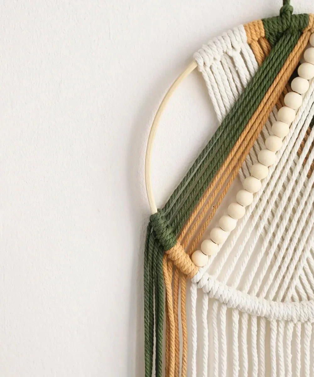 Ce magnifique attrape-rêve, situé à la frontière du style amérindien et du charme bohème, saura vous séduire par son élégance délicate et ses teintes beige, verte et jaune moutarde. Exprimez votre passion pour la décoration bohème avec cette superbe création qui marie symbolisme et esthétique, apportant de ce fait une jolie touche de pureté à la décoration de votre chambre à coucher.