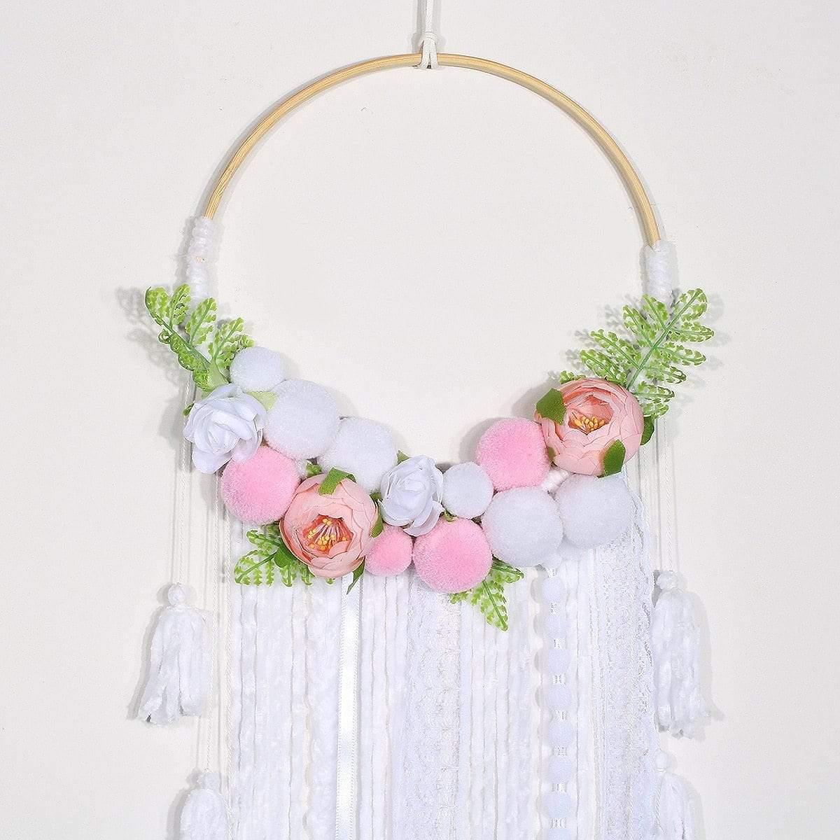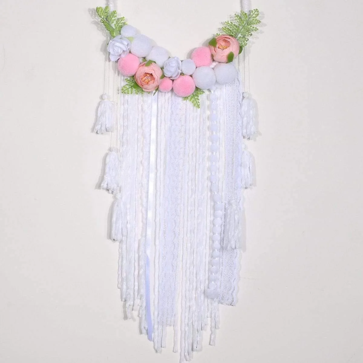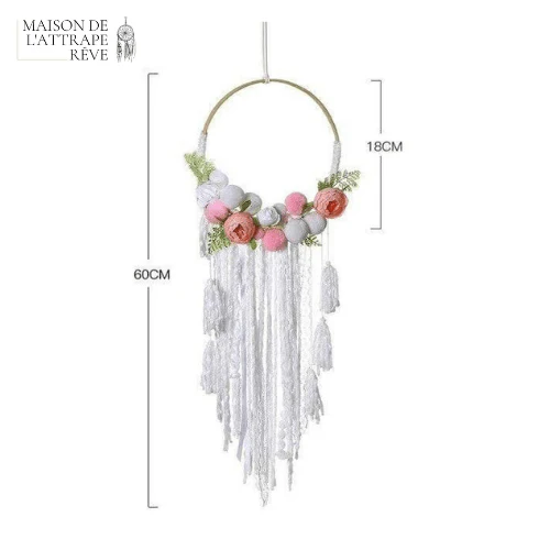 Éblouis tes invités par sa dentelle d’un blanc resplendissant, ses pompons blancs et roses viendront adoucir l’ensemble en ajoutant une note glamour et raffinée. L’ensemble suspendu par un anneau en bambou naturel viendra équilibrer le tout sous une note harmonieuse, naturelle et aux couleurs tendres !