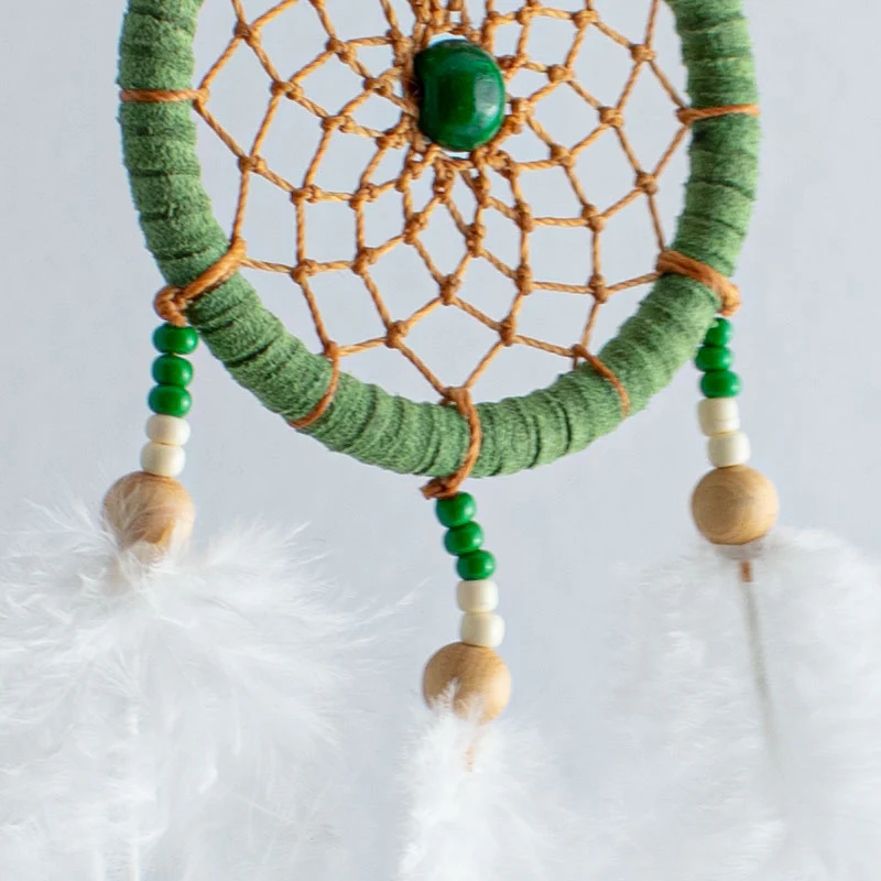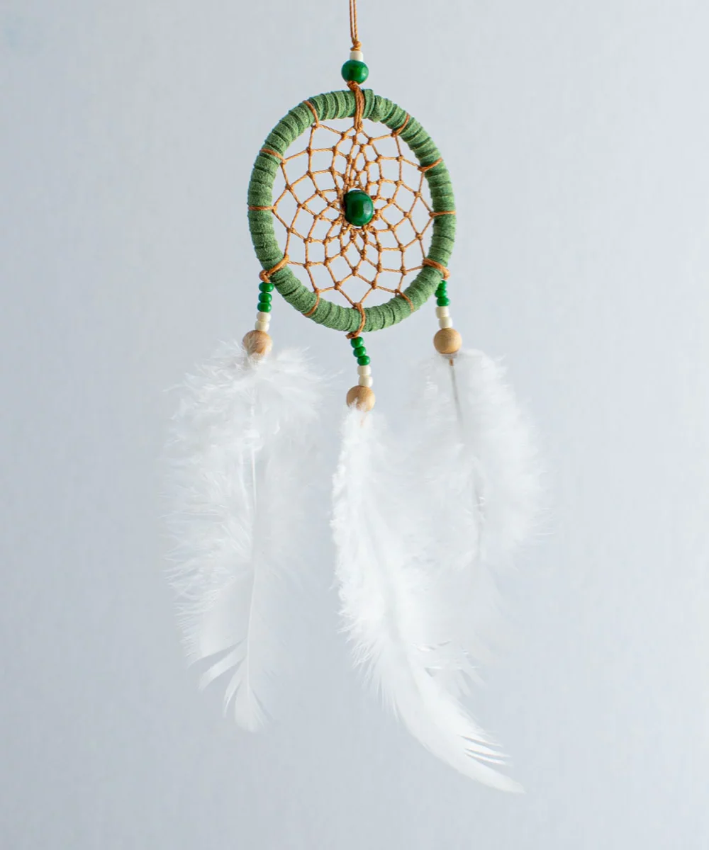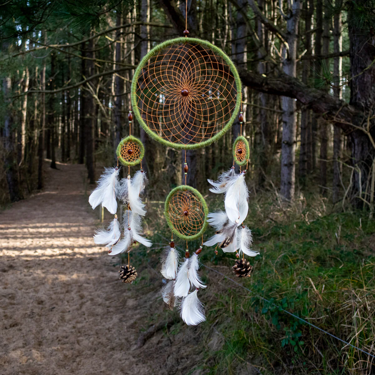 “Pomme de sapin” est un attrape-rêve artisanal vert qui célèbre la forêt, symbole du cercle éternel de la vie. Il est fabriqué à la main avec des pommes de pin ramassées dans la forêt d’Ecault, lieu enchanteur de la Côte d’Opale.
