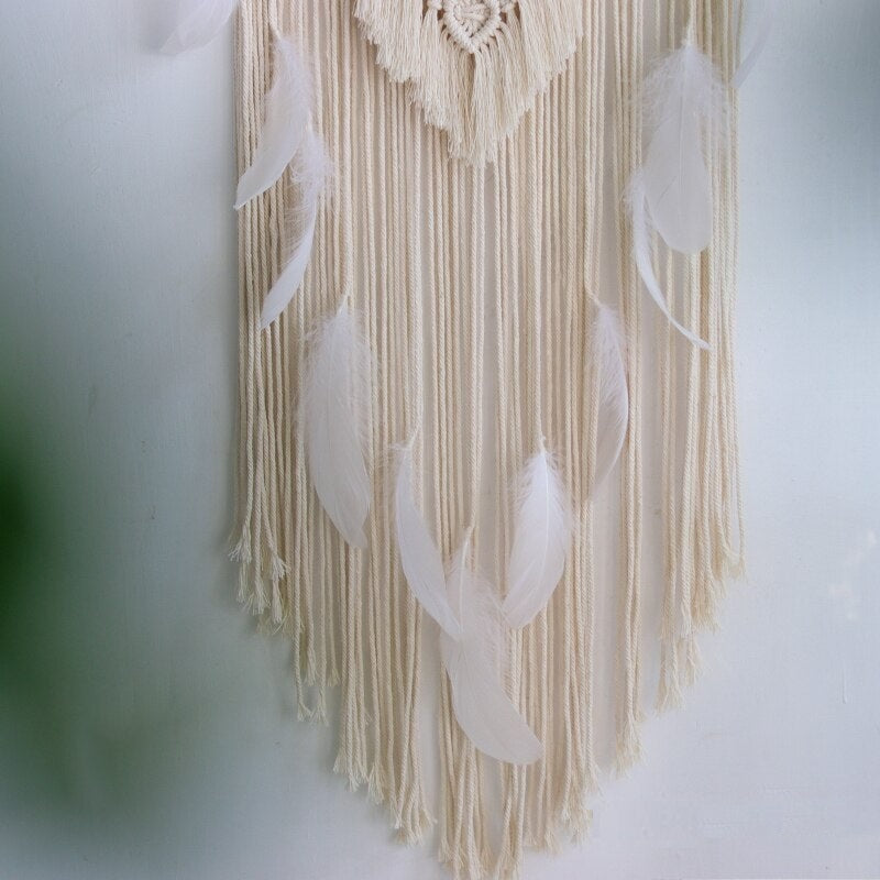 Ce capteur de rêves géant en tressage est un des plus grands de notre collection. Véritable création artisanale aux influences bohémiennes et amérindiennes, il apportera une touche de légèreté et d’apaisement à la décoration murale de n’importe quelle pièce. Ses tissages complexes vous captiveront tandis que de petites perles de bois viendront couronner le tout de larges plumes tissées et donneront à cette pièce un aspect aérien certain !