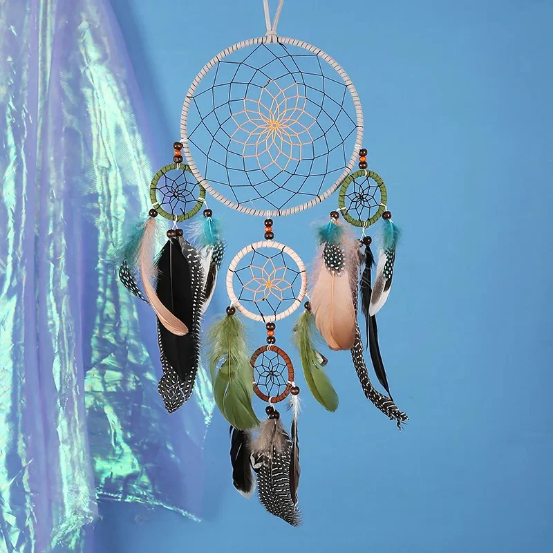 Chaque détail de cet attrape-rêves a été soigneusement conçu pour capturer l’esthétique moderne tout en préservant la symbolique traditionnelle. Les nuances harmonieuses de bleu, blanc et vert s’entrelacent avec grâce, créant une pièce artistique qui attire l’œil et apaise l’âme.