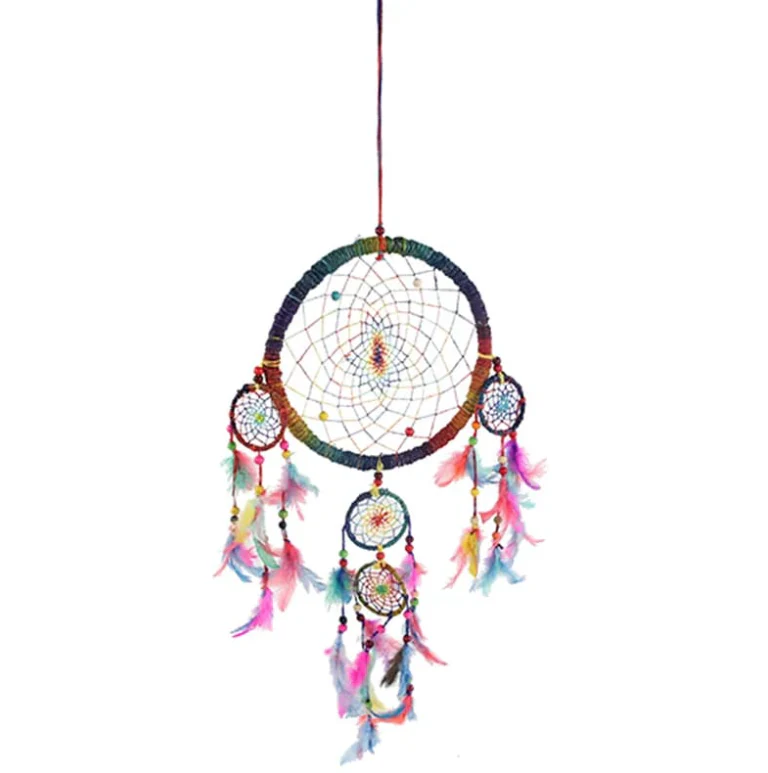 Traditionnellement, l’attrape rêves est composé d’un cercle en bois, représentant le cercle de la vie, et d’un filet tissé qui capture les mauvais rêves. Les rêves positifs, eux, glissent doucement à travers le centre et descendent le long des plumes pour atteindre le dormeur. Suspendu au-dessus d’un lit ou près d’une fenêtre, il agit comme un filtre spirituel, permettant uniquement aux énergies bienveillantes de passer.