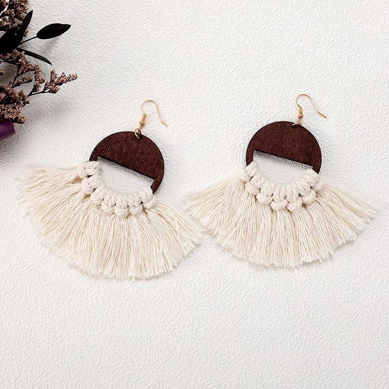 Voici la paire de boucles d’oreilles de maison tressage faite main en coton et bois
