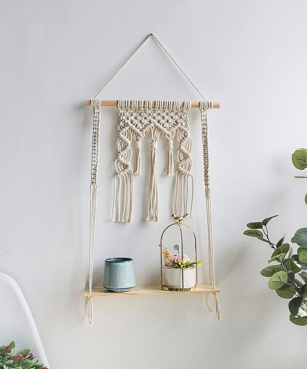 L’alliance du bois et du macramé apportera immédiatement un charme rustique et artisanal à votre pièce en y arborant cette fabuleuse étagère murale suspendue. Que vous soyez un amoureux de décoration boho, ethnique ou bien scandinave, cet élément décoratif unique et plein de caractère vous comblera à coup sûr de bonheur.