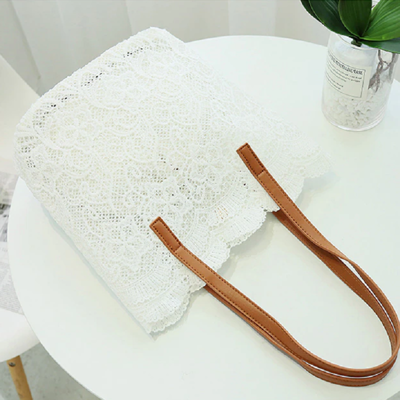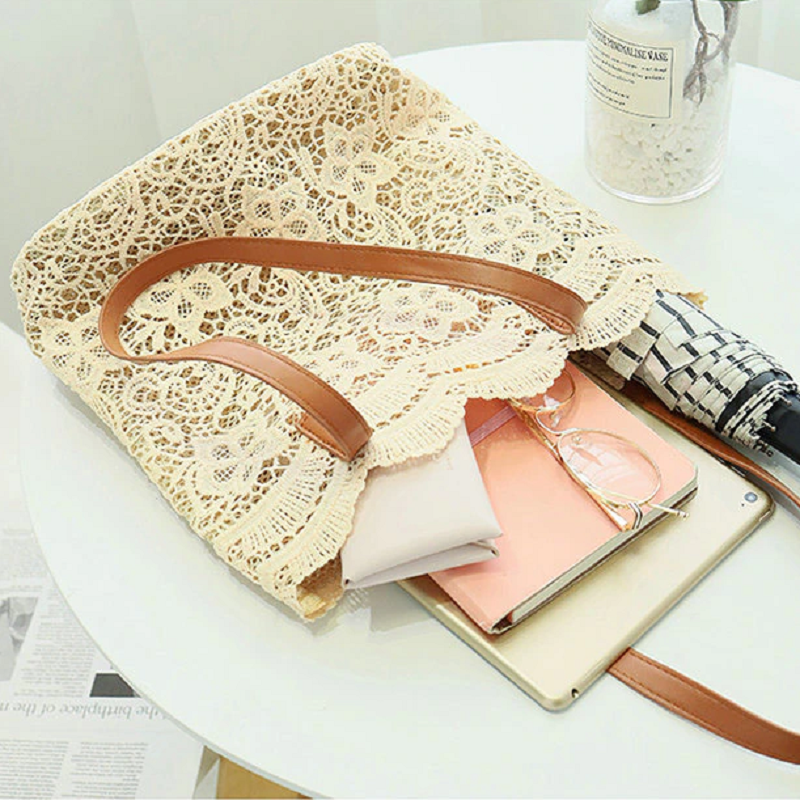 Voici notre grand sac en tressage avec sa fine dentelle et ses anses en cuir
