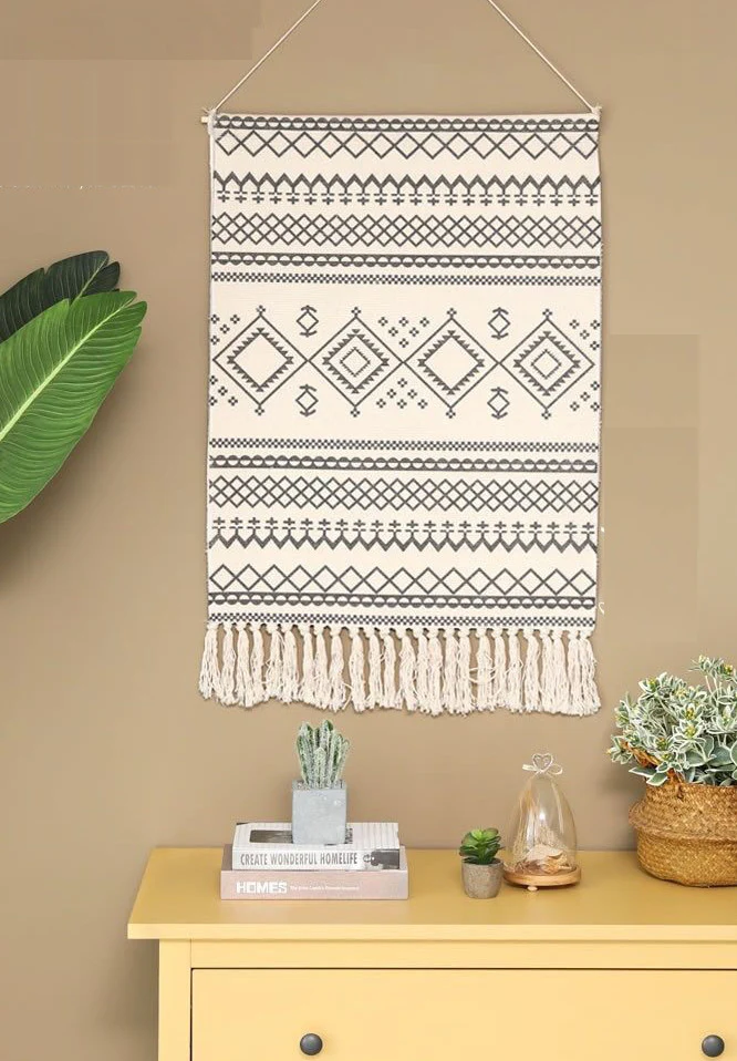 Sortez de l’ordinaire, et optez pour une tapisserie murale dans les tons cotons et gris avec son design inspiré des figures amérindiennes.