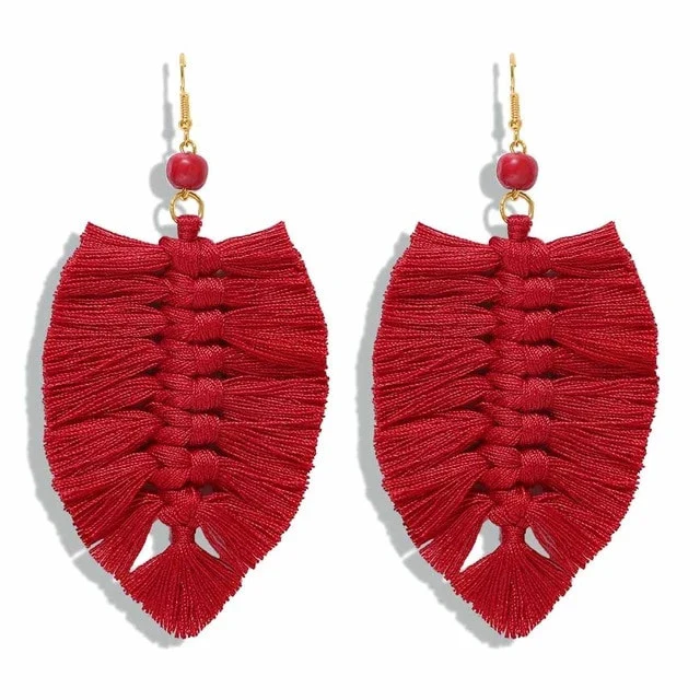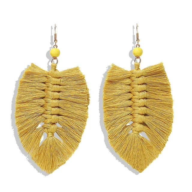 Optez pour nos boucles d’oreilles en forme de plume tressées avec du fil de coton. Elles sont disponibles en 8 coloris : saumon, vert, marron, rouge, bleu, moutarde, bordeaux, multi color.