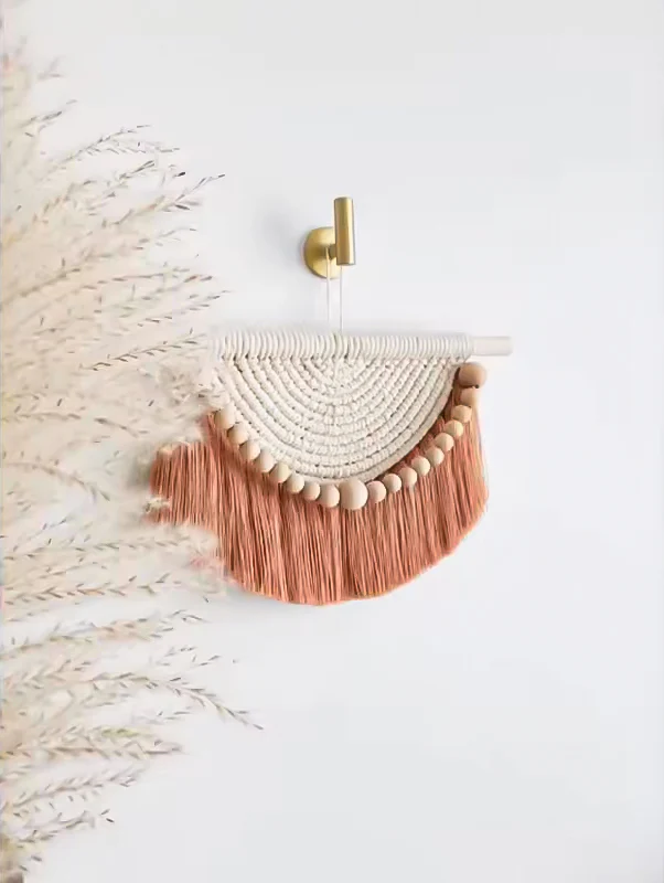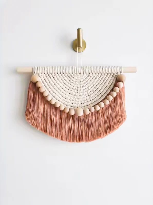 - Ajoutez une touche douce et naturelle à votre intérieur avec cette décoration murale en macramé, ornée de perles et colorée de teintes délicates, du beige et le pêche.