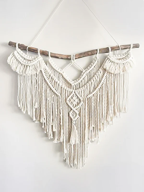 Ses longues franges de coton peigné, ses motifs géométriques et son grand format lui donnent un charme bohème chic très tendance. Ce macramé mural artisanal égayera et sublimera les murs de votre espace de vie.