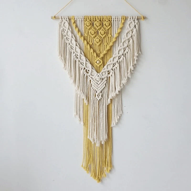 Plongez votre intérieur dans un décor scandinave grâce à ce splendide macramé mural jaune moutarde. Idéal pour instaurer une ambiance chaleureuse et réconfortante dans votre intérieur. Succombez aux magnifiques détails de son tissage artisanal en macramé.