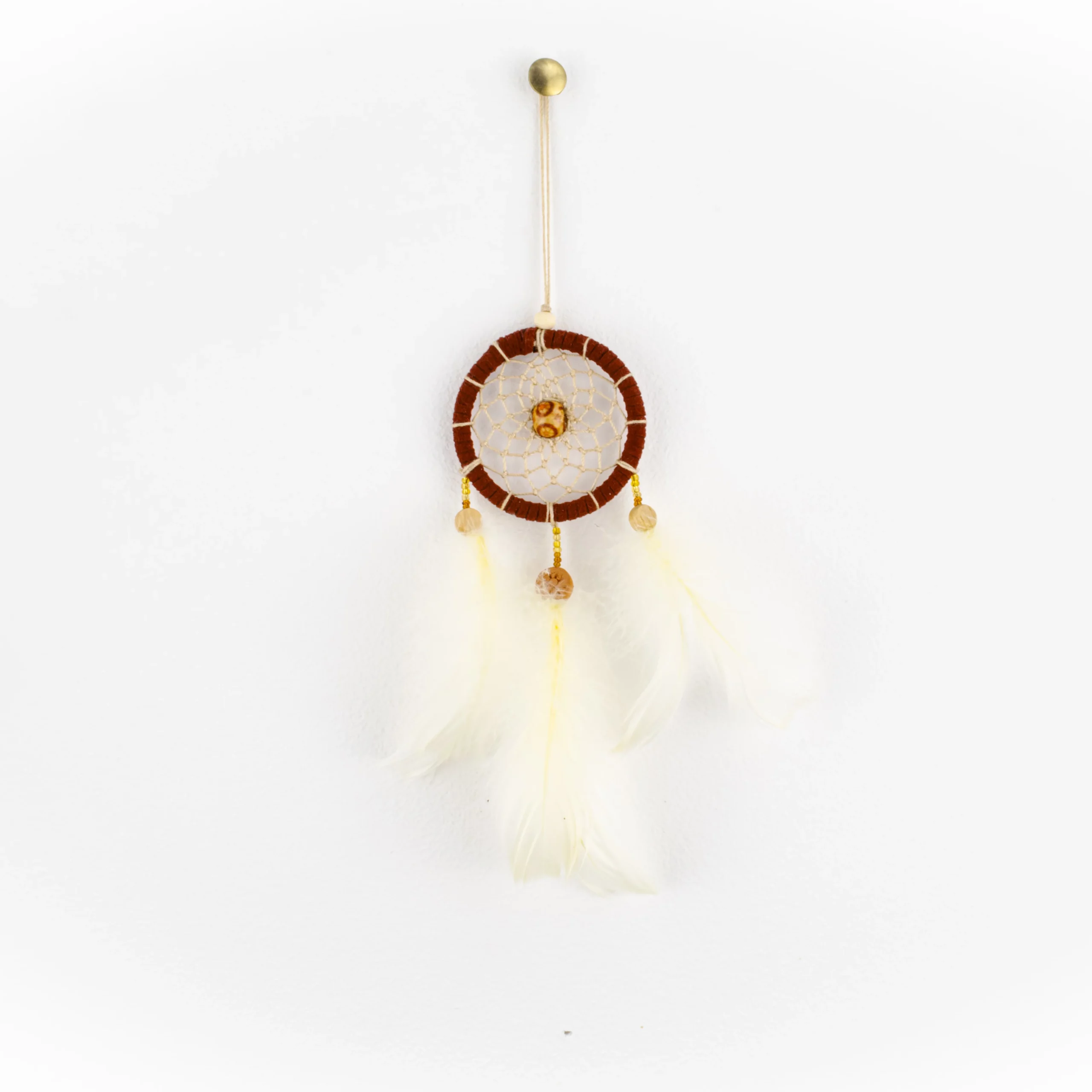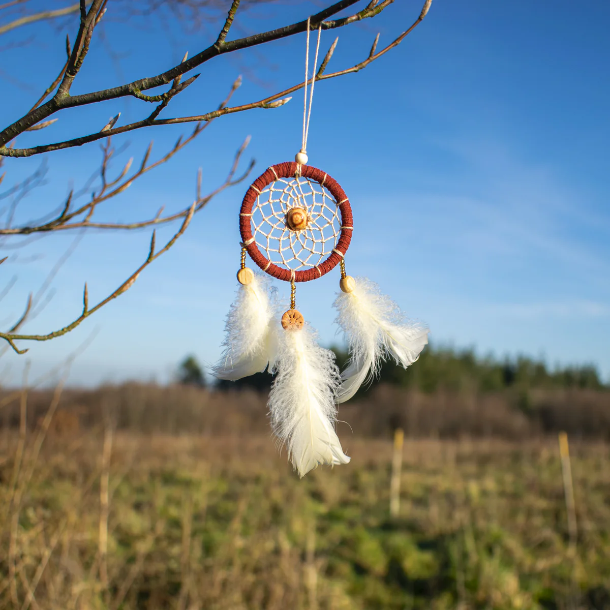 Mini attrape-rêve “Rosée du matin” est un mini attrape-rêve doux et épuré, dont les teintes chaudes et les nuances de grenat évoquent la rencontre des premiers rayons du soleil avec la rosée du matin perlant sur la toile.