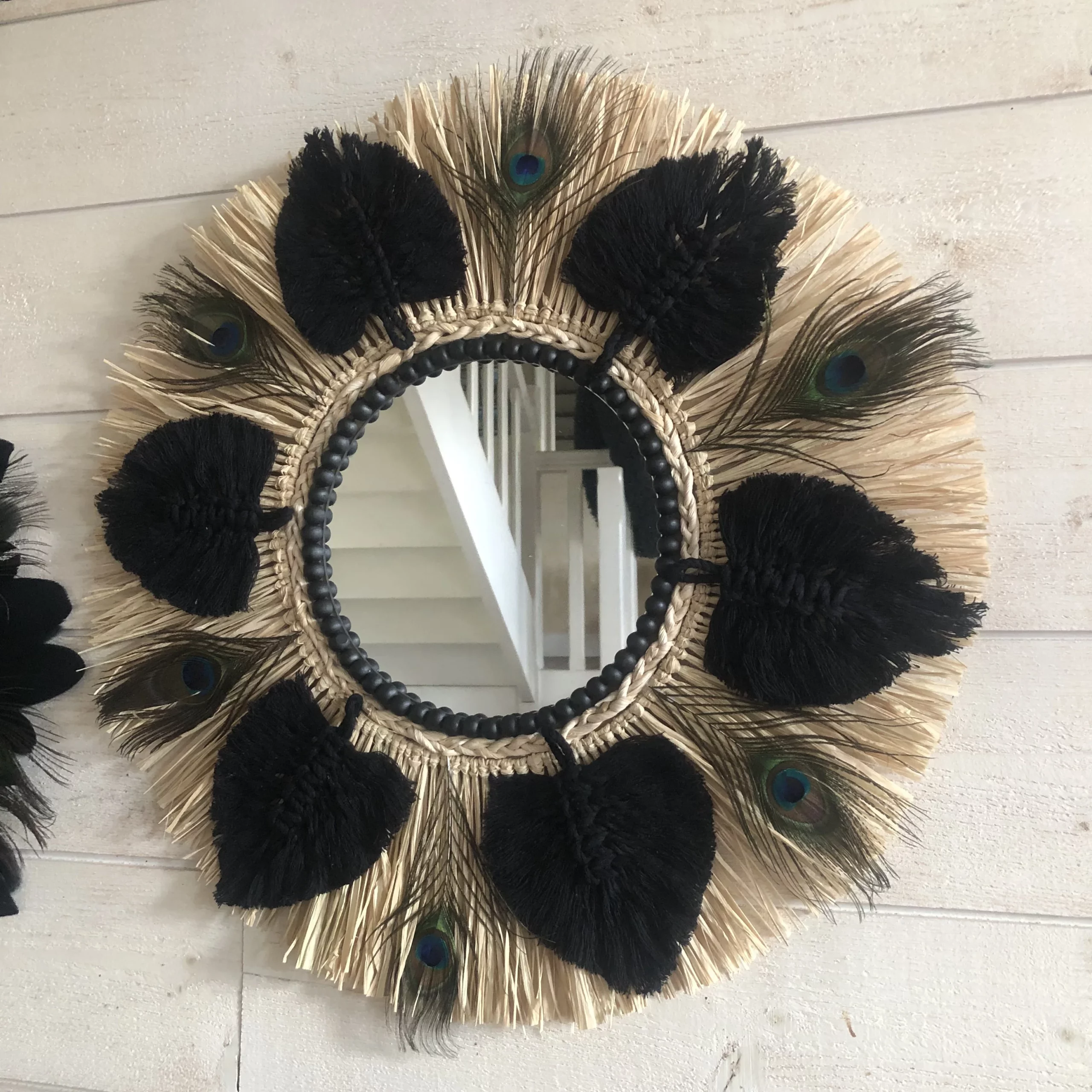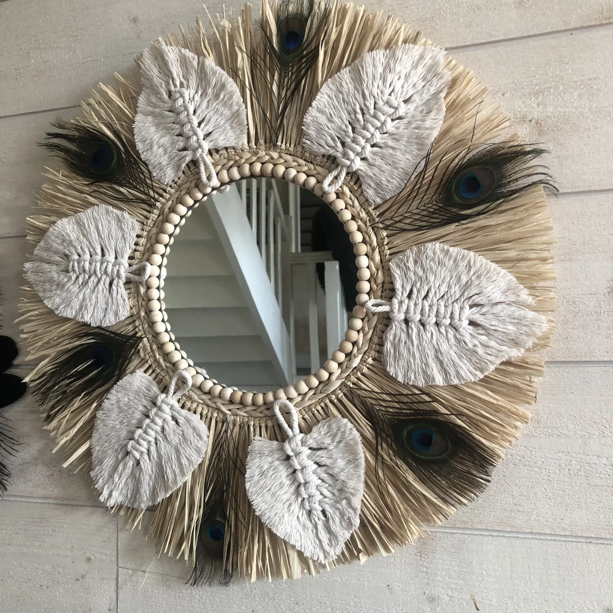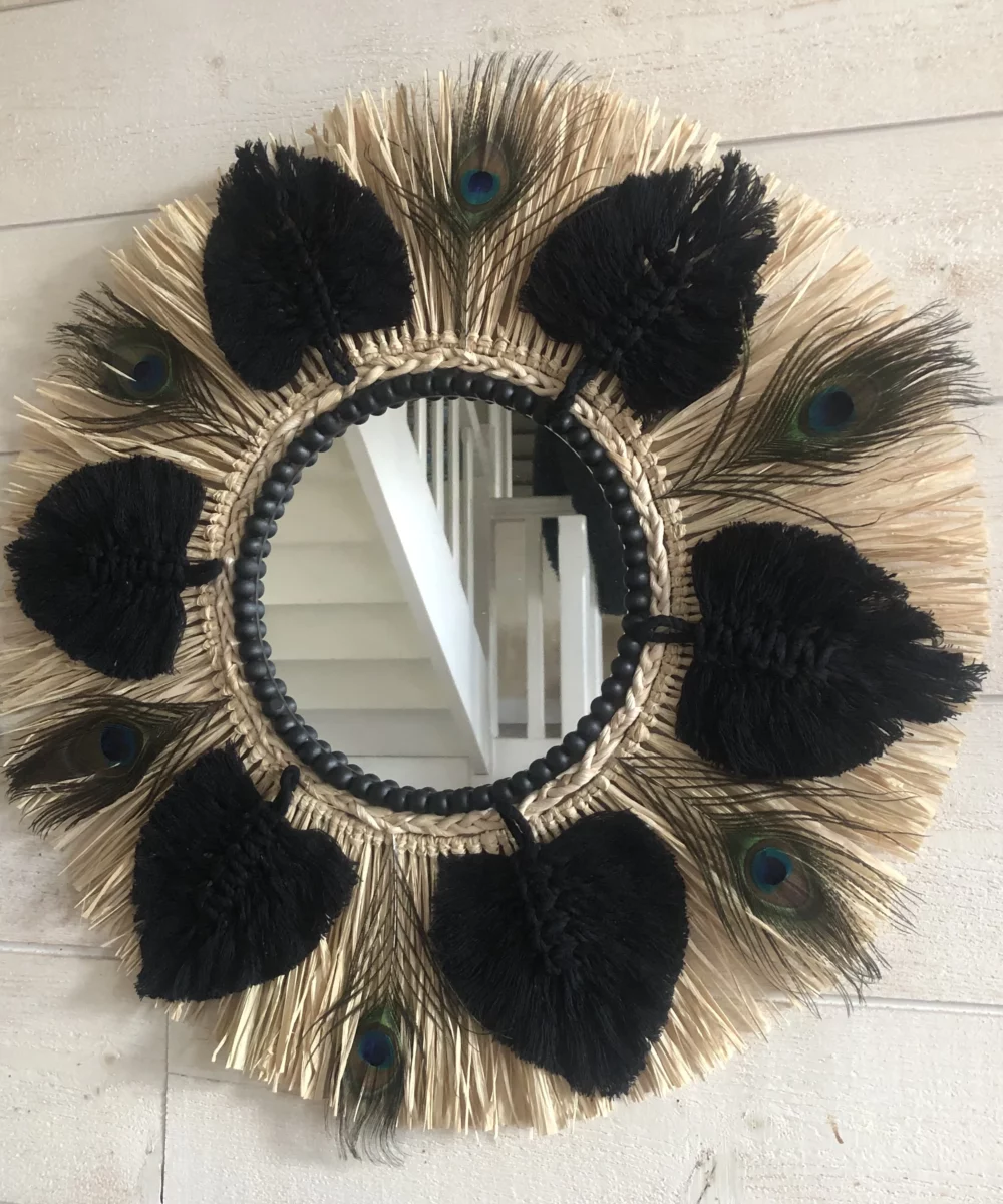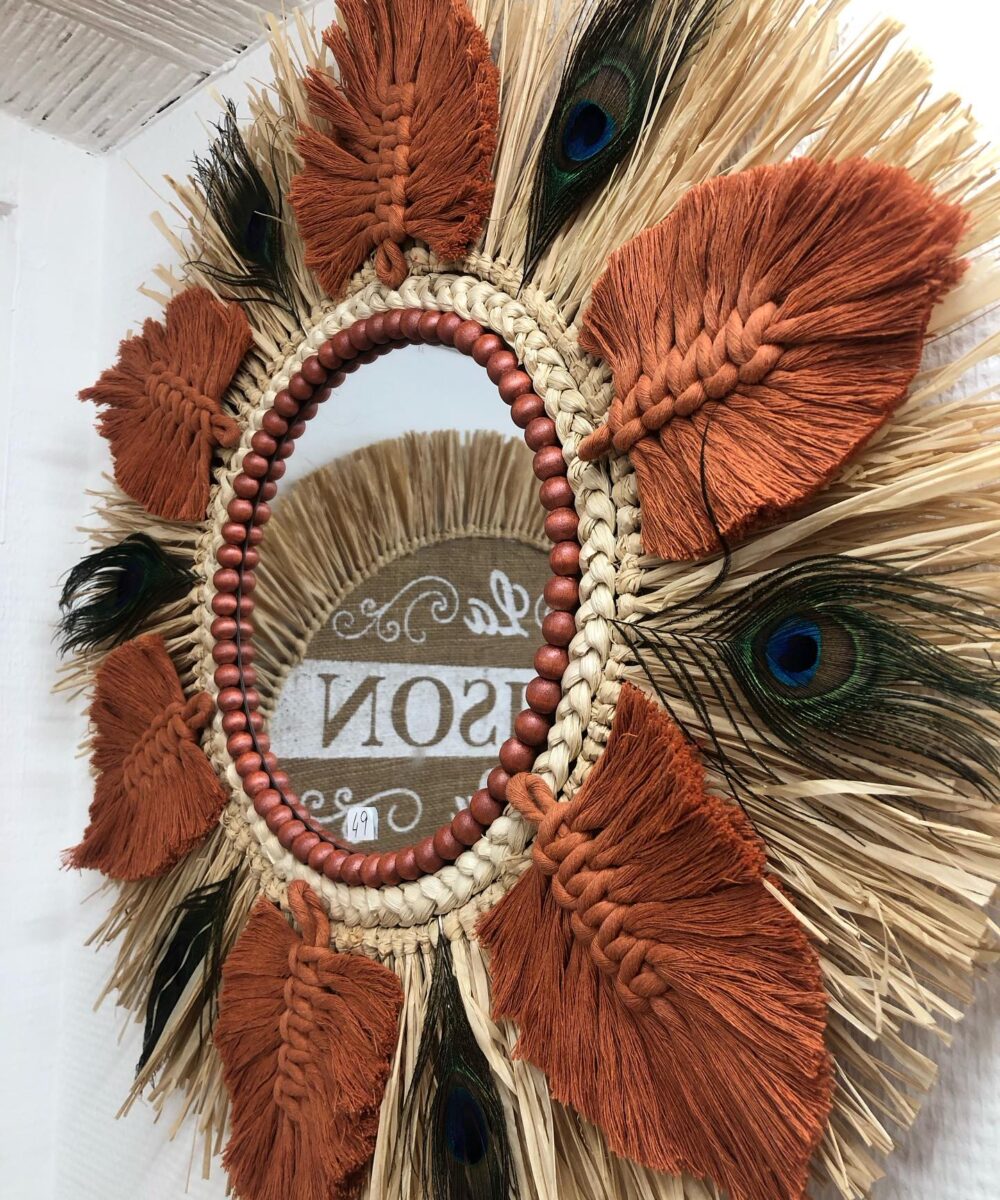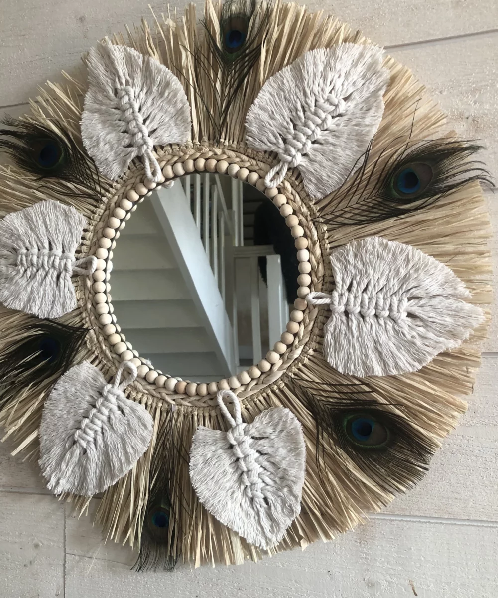 Grande nouveauté SWANELL pour ce miroir très original avec un support bois, une glace de 20 cm (taille au choix ), de la corde de maïs tressée, du raphia naturel, des feuilles en coton macramé de tous les coloris possibles sur commande, et des plumes de paon entre chaque feuille en coton. Modèle très original, unique, fabriqué et imaginé par Angèle, créatrice charentaise !