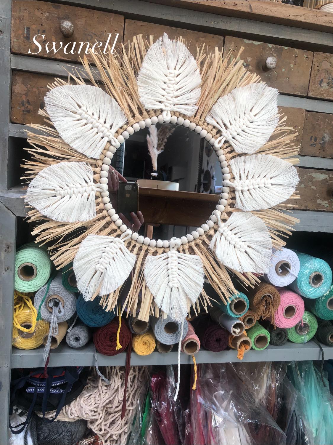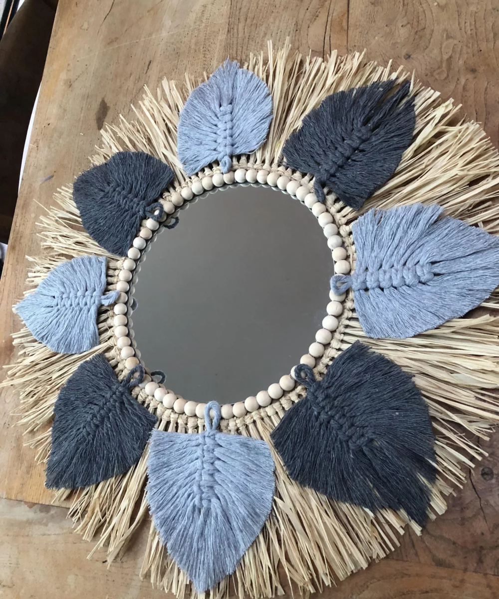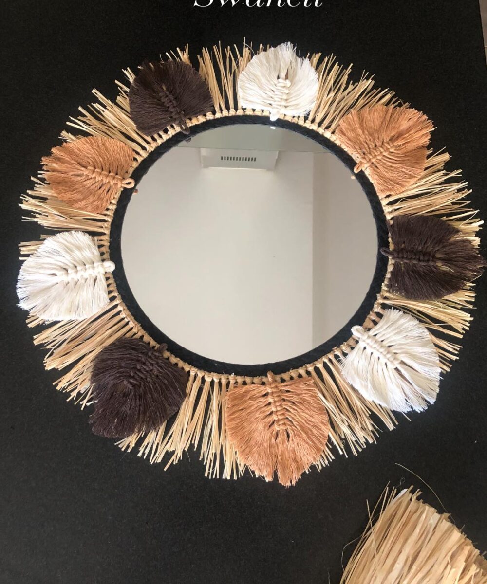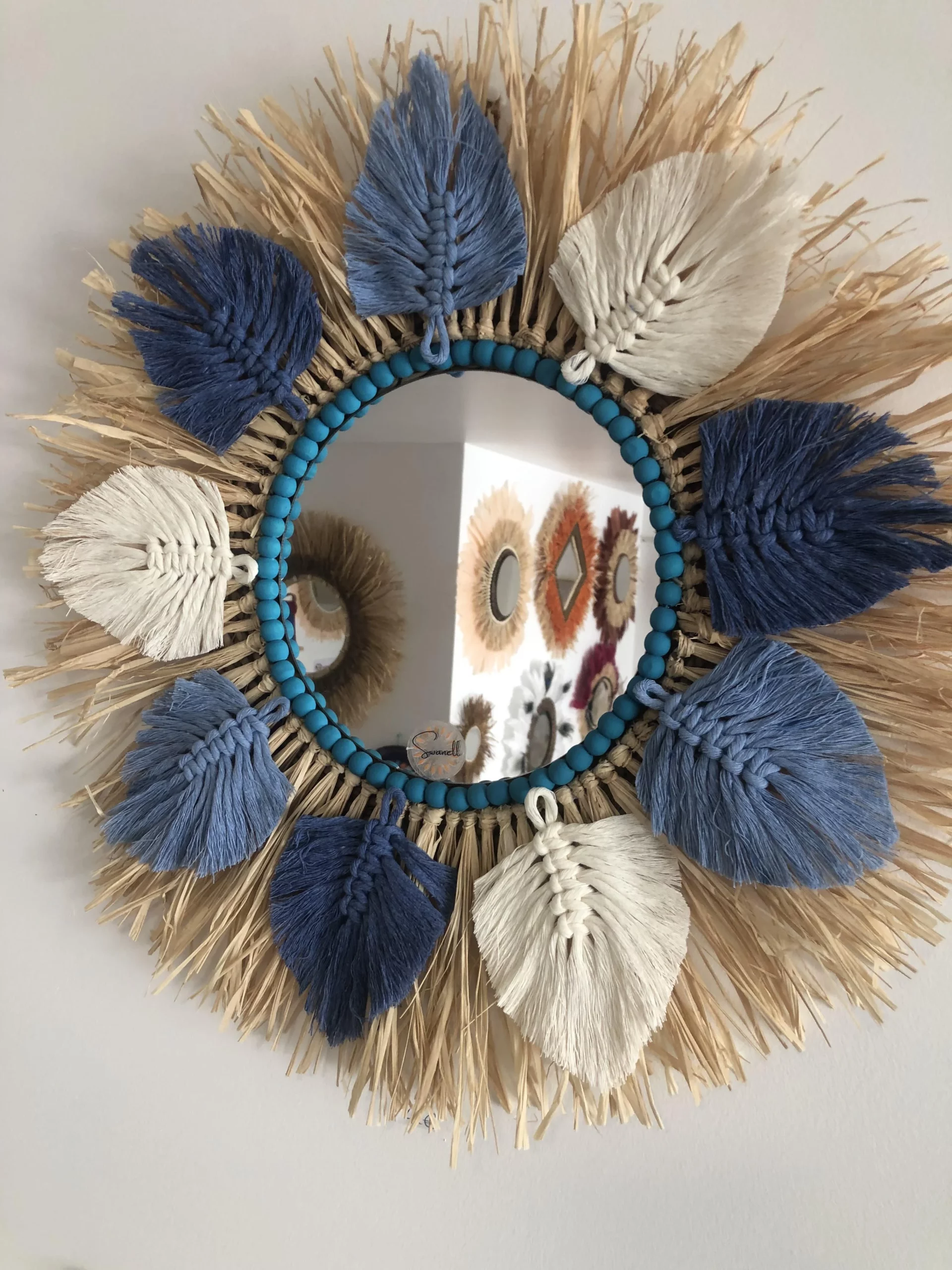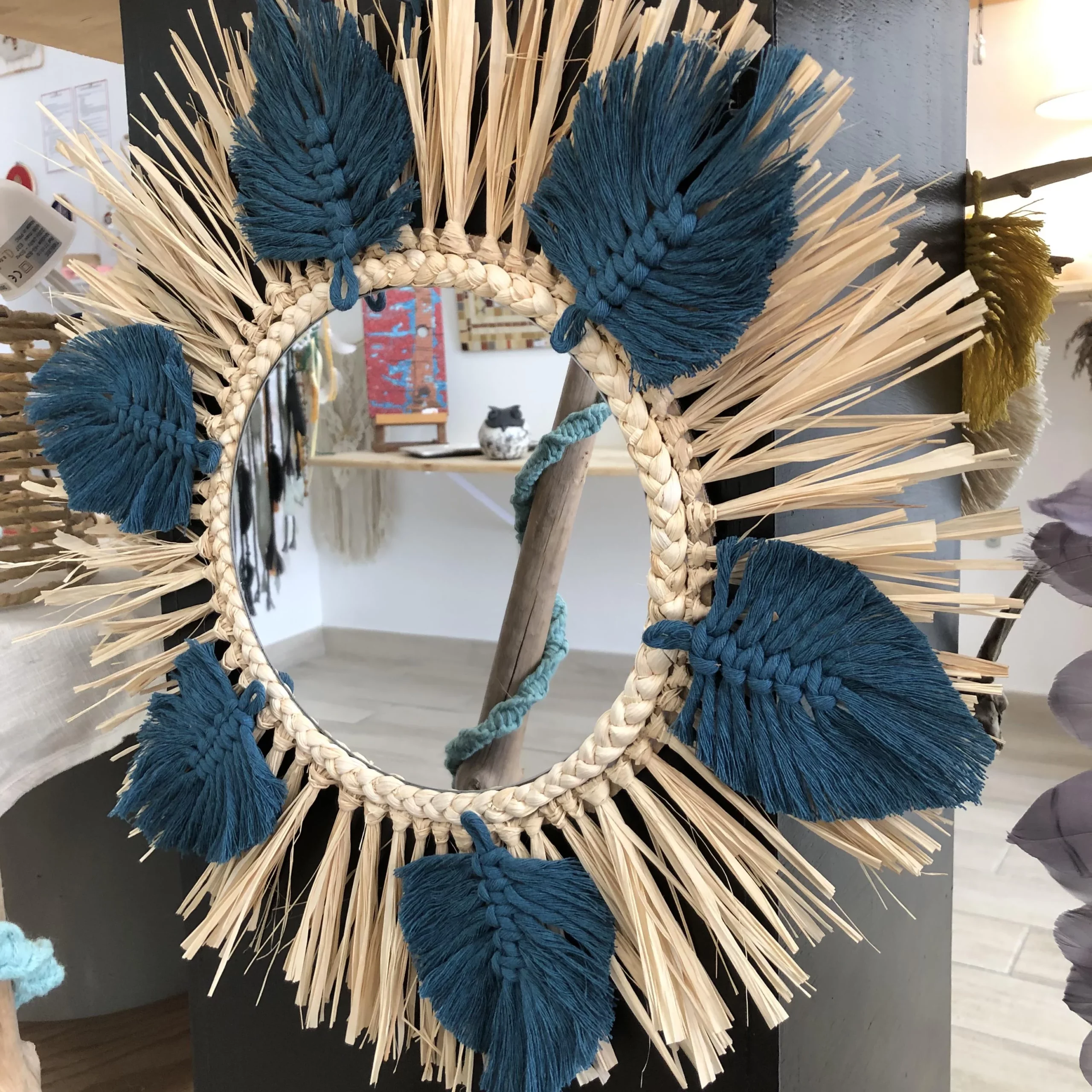 Miroir en raphia naturel et feuilles en coton macramé (différents coloris au choix)
