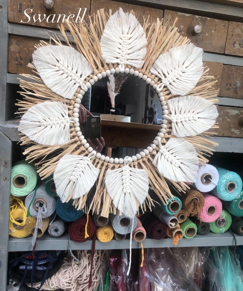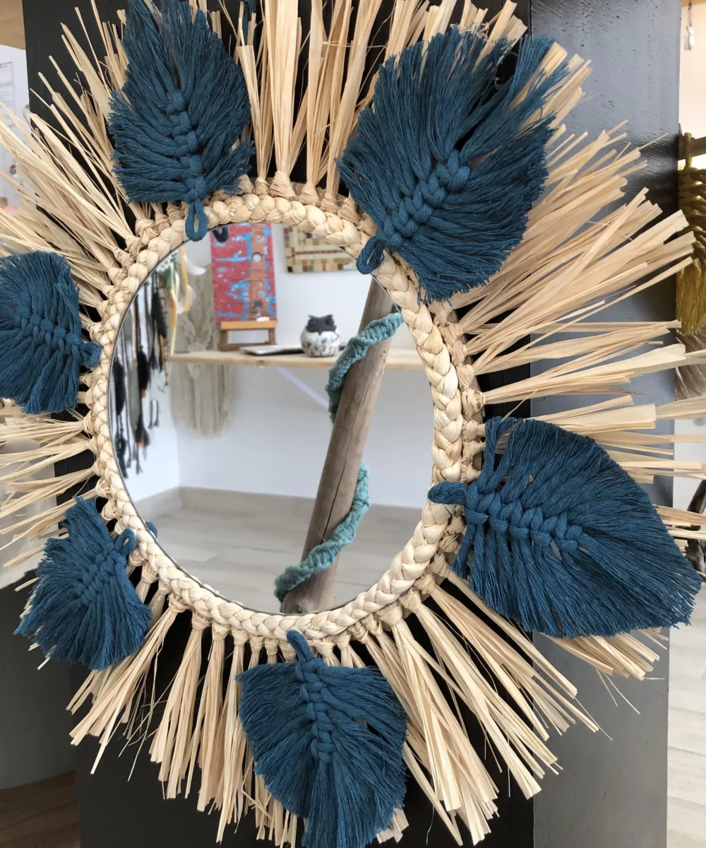 Ce miroir original en raphia naturel et feuilles en coton est une création unique imaginée par Angèle, une créatrice charentaise. Avec ses 2 matières originales et son macramé artisanal, ce miroir apportera une touche de fantaisie et d’originalité à votre décoration intérieure. Une pièce unique et artisanale qui fera sensation !