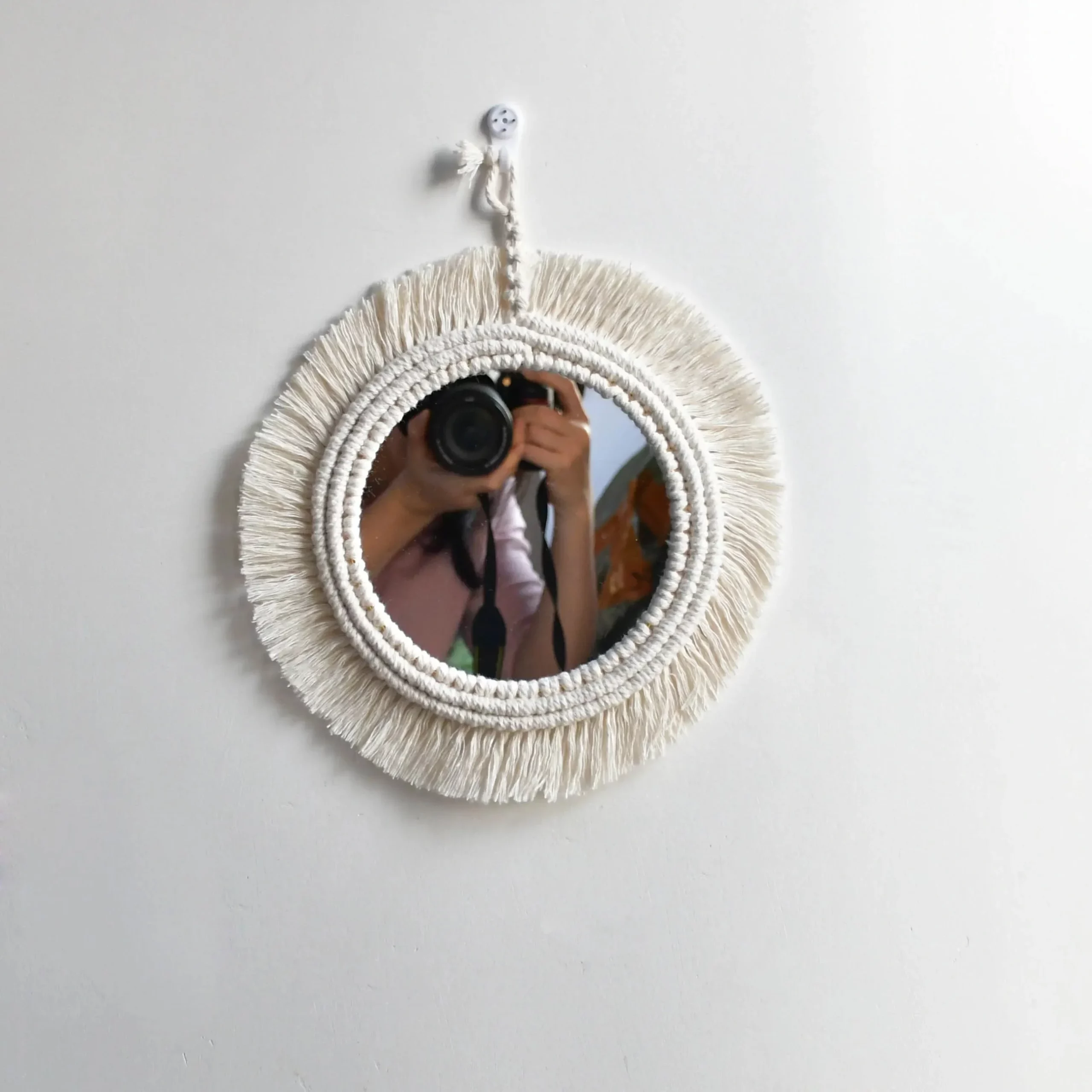 Ajoutez une touche de chaleur et de nature à votre intérieur avec ce miroir coloré en macramé. Cette pièce vive dynamisera votre espace de manière saisissante. Son design, mêlant habilement le coton tressé et les franges, lui confère une esthétique à la fois riche et captivante, parfaite pour être exposée dans n’importe quelle pièce.