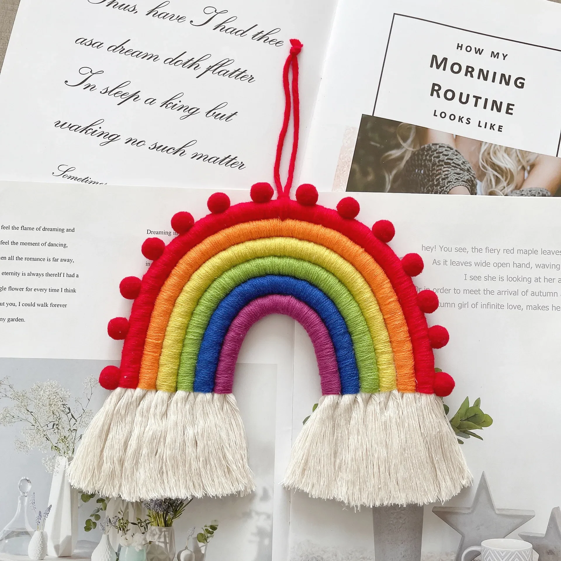 Vous serez directement séduit par son magnifique dégradé de couleurs aux tons pastels ou vifs, à votre convenance, ainsi que par ses adorables petits pompons en macramé qui lui confèrent toute son originalité. L’arc-en-ciel symbolise l’espoir et le renouveau après la pluie, faisant de lui un symbole puissant à garder près de soi. Offrez à votre enfant le bonheur d’un décor à la fois harmonieux et réconfortant.