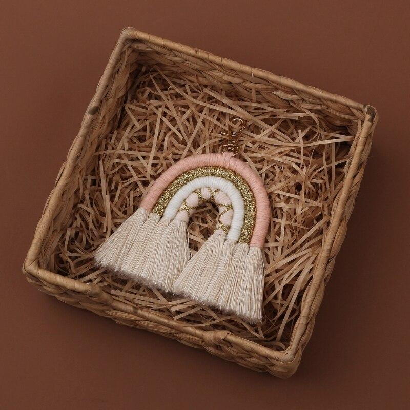 Ce magnifique porte clé arc-en-ciel en tressage est une réalisation faite main en coton naturel.