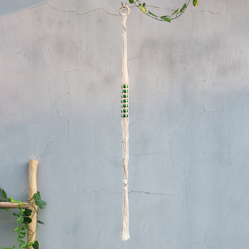 Voici notre suspension en tressage pour plantes avec ses perles vertes.