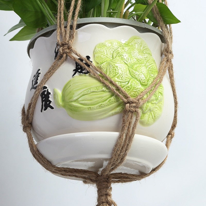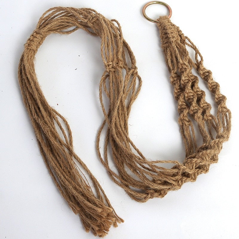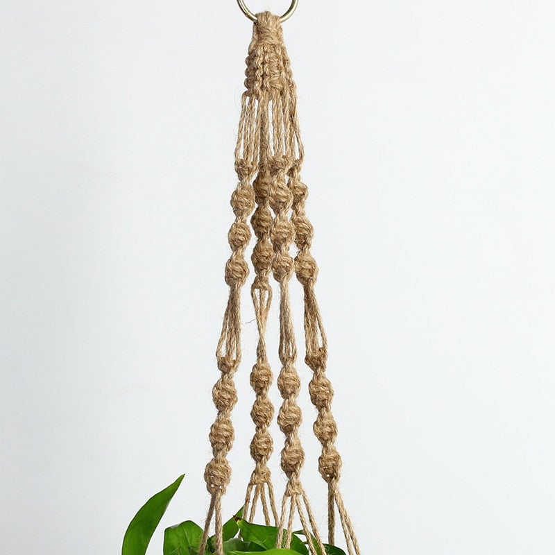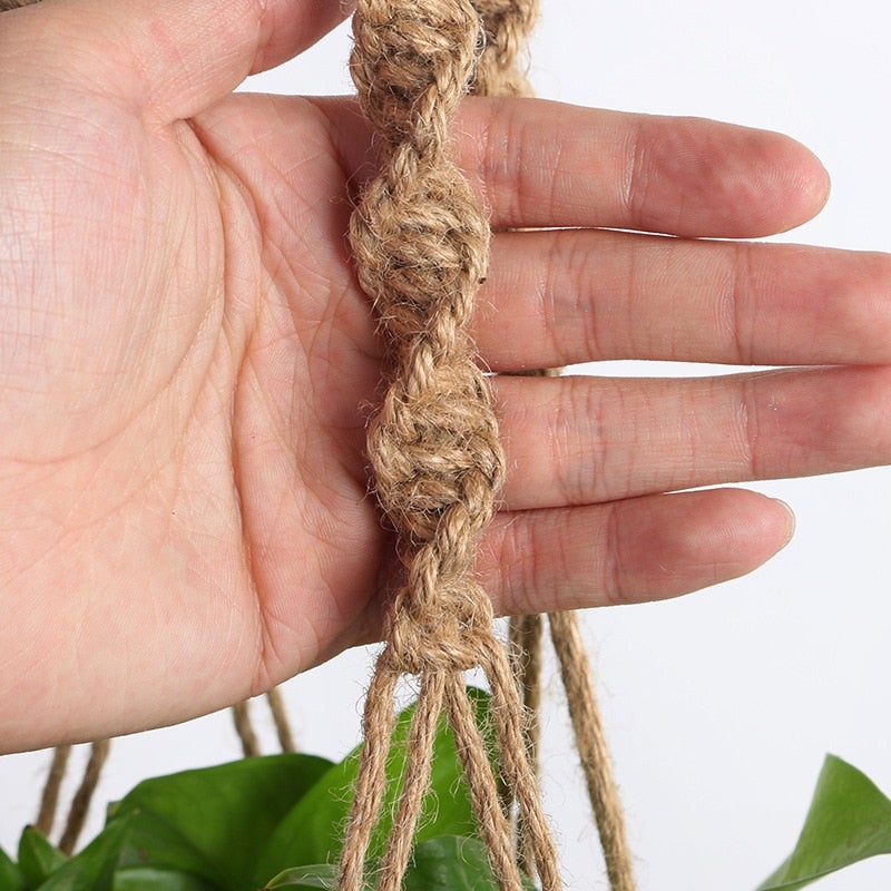 Une suspension pour fleur en tressage en toile de jute unique en son genre.