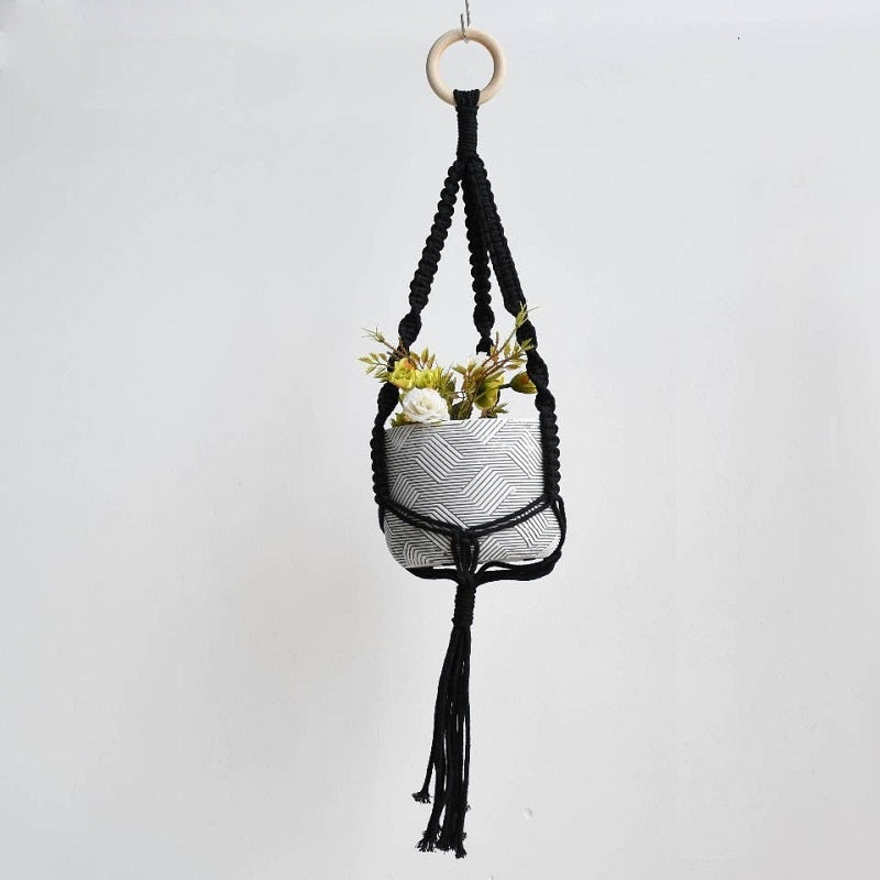 Les porte-plantes en tressage constituent une belle décoration suspendue qui s’adapte à tous les styles d’intérieur. Rendez votre espace plus agréable encore en choisissant de jolis pots de plantes dans des tons clairs pour contraster avec le design noir de cette pièce. Ainsi vous pourrez créer un environnement semblant être d’extérieur, même si vous êtes à l’intérieur.