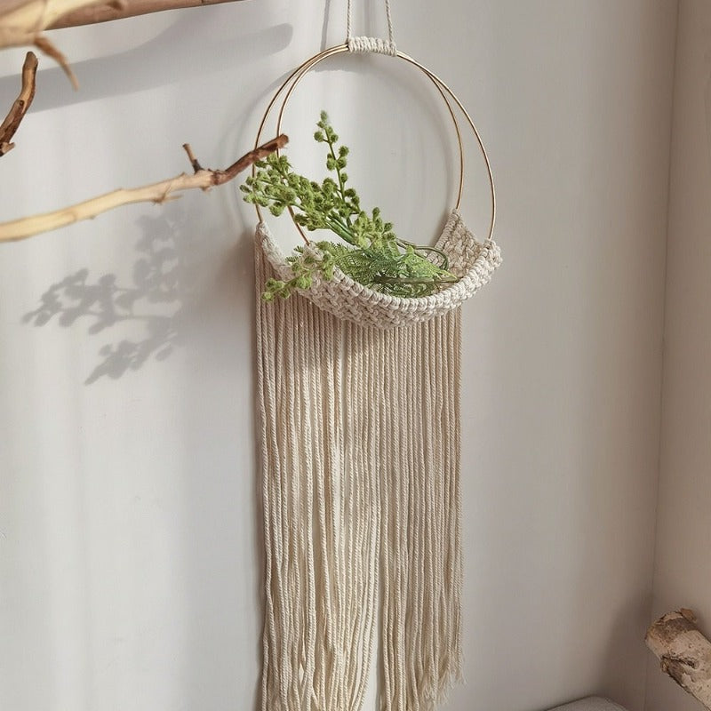 Décorez librement cette suspension en tressage avec un pot de fleurs ou avec des plantes tombantes pour plus de volume. Son large tissage apporte de la longueur à notre création tandis que le panier en filet de coton et les anneaux en métal apportent un bon maintien général.