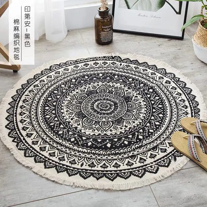 Sublimez instantanément votre intérieur avec ce magnifique tapis macramé rond, une pièce d’exception dont les riches motifs géométriques et les élégantes franges en font un véritable bijou de décoration bohème.