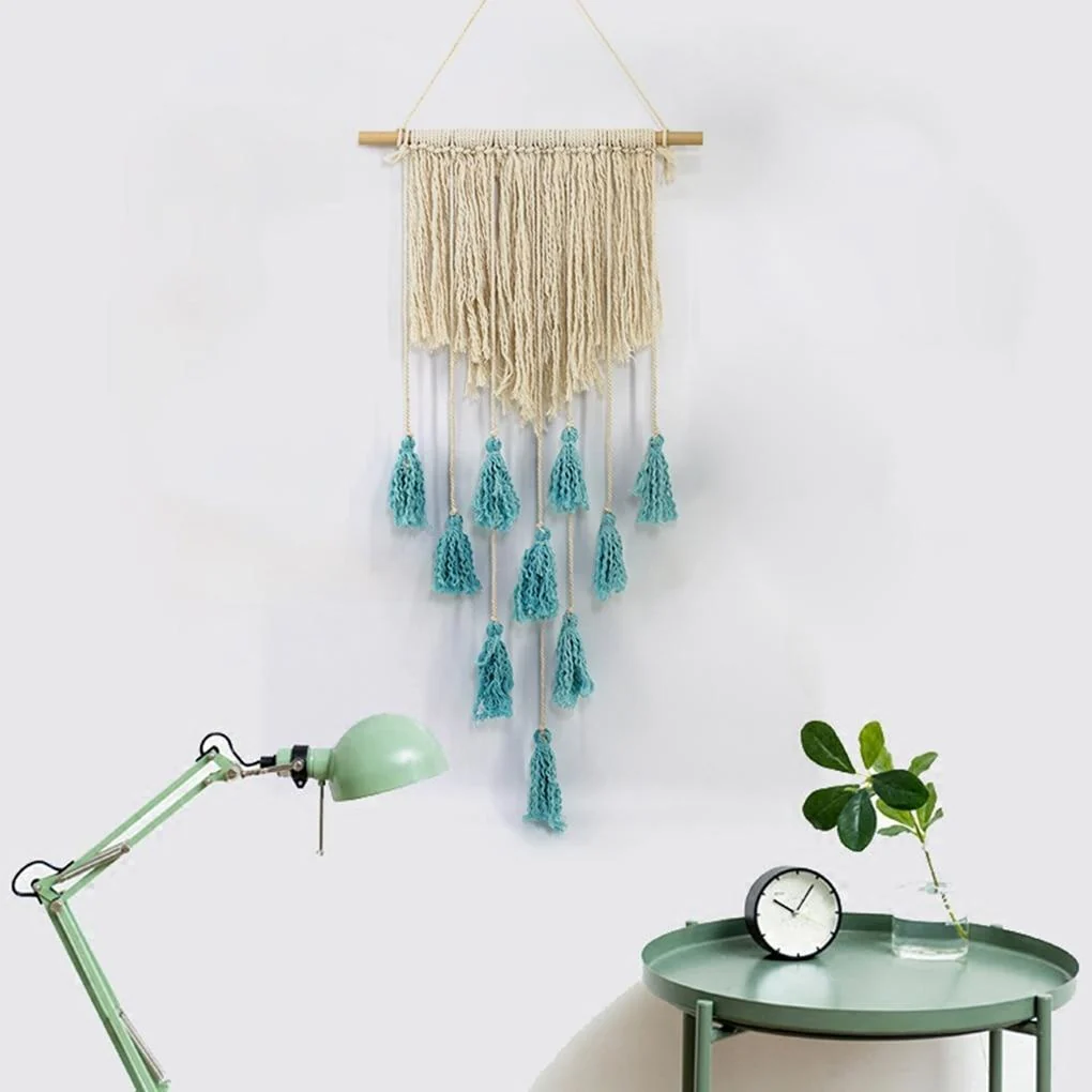 Avec sa cascade de pompons bleus, cette tenture en macramé ressemble à un petit nuage de pluie. Cette décoration murale apporte de la fraîcheur à votre intérieur, une touche de légèreté et une pointe de couleur.