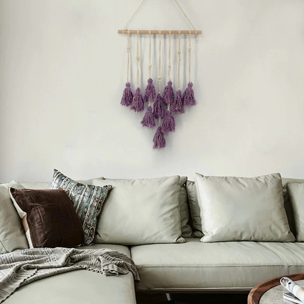 Une tenture macramé et ses pompons violets