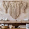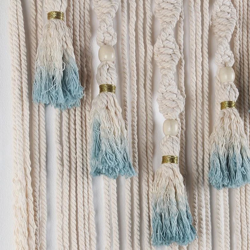 Accrochez cette tenture en macramé au mur de votre chambre ou salon et vous pourrez ressentir tout l’esprit bohème qui s’en dégage. La tenture murale en macramé Lili c’est une subtil association entre le coton, le bois et le métal grâce à une technique de tissage ancestrale et artisanale. Les extrémités des pompons sont teintées d’un bleu clair couleur ciel pour apporter un peu plus de fraîcheur à l’ensemble.