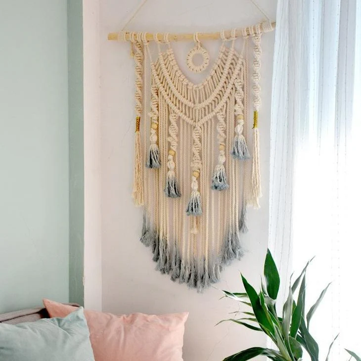 - Macramé noué à la main, avec perle en bois et bague en métal doré
